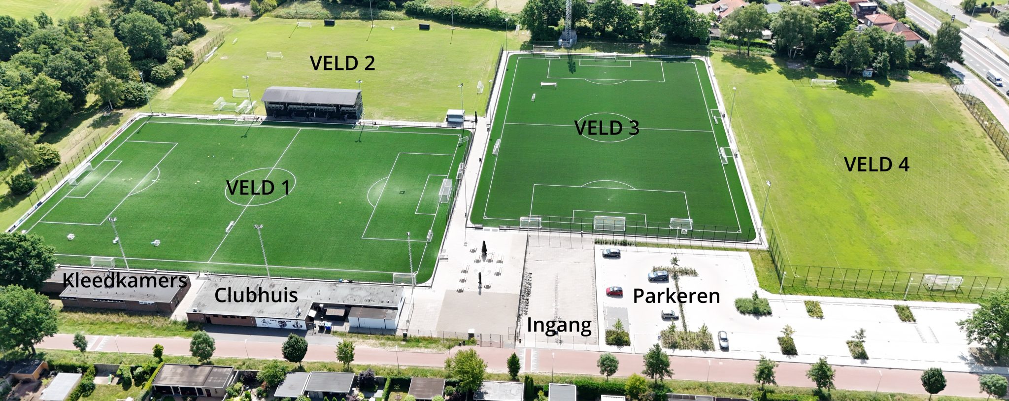 Onderaan op de foto de Verlengde Sportlaan, met in het midden de ingang van ons complex. Rechts van de ingang bevindt zich de ruime parkeerplaats, met een tweetal plaatsen bestemd voor invaliden, direct naast de ingang. Ons clubhuis en de kleedkamers bevinden zich tussen de Verlengde Sportlaan en veld 1.